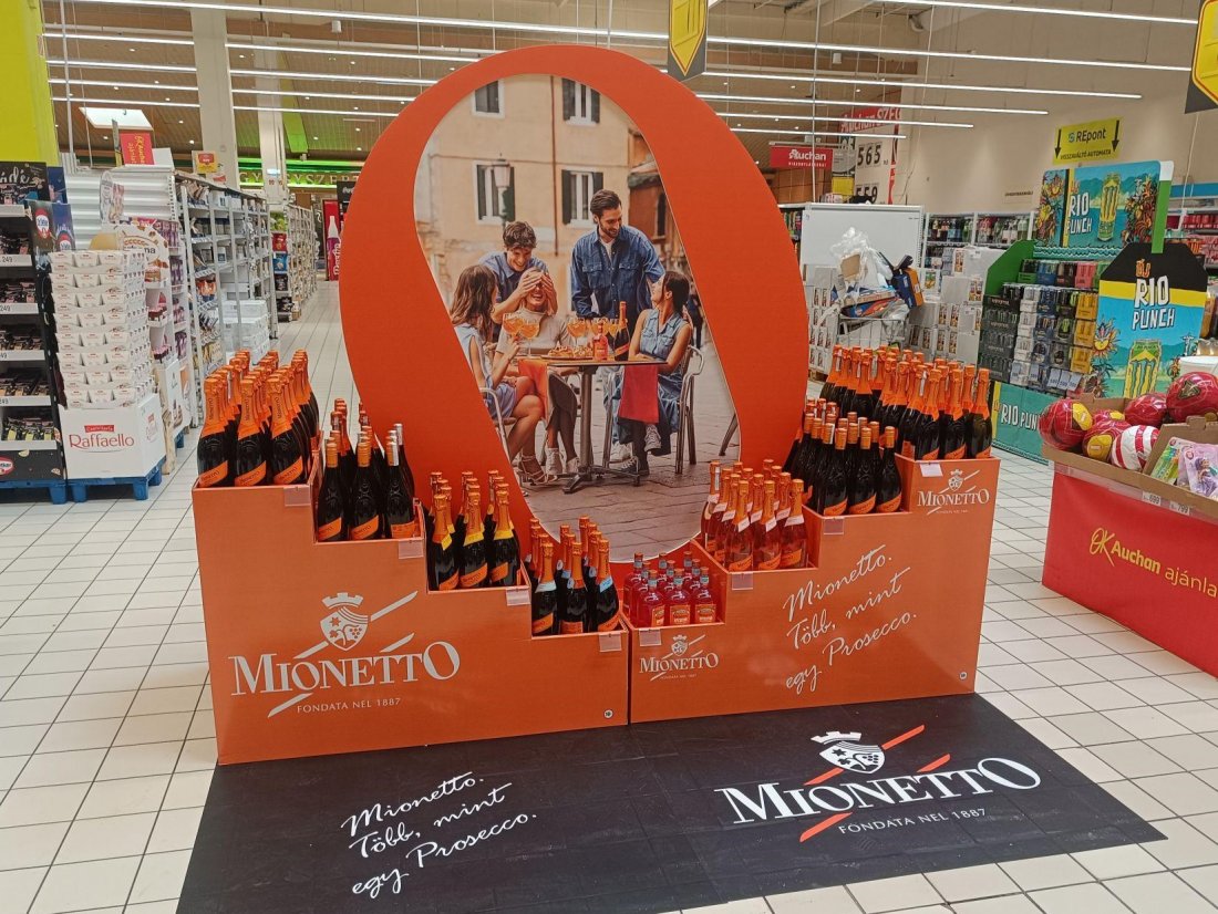 A Törley Mionetto narancssárgában pompázó display különlegessége a látványában rejlik: lépcsőzetes, tükröződő kialakításának köszönhetően bárhonnan nézzük, ugyanaz a páratlan összhatás fogad. A Törley Pezsgőpincészet számára készített installáció középpontjában egy monumentális „O” betű áll, amely a Mionetto márkanévre is utal.